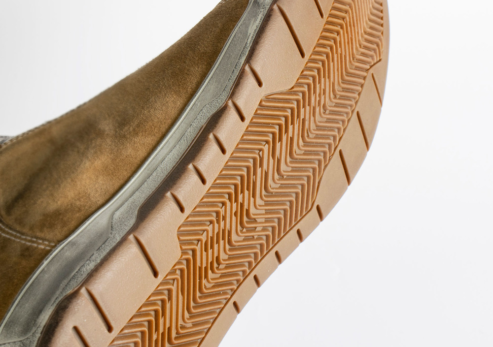La tomaia è costituita da pelle bovina affiancata da aree scamosciate microforate sul lato esterno, e l’effetto "invecchiato” dei materiali dona un sapore vintage di tendenza.