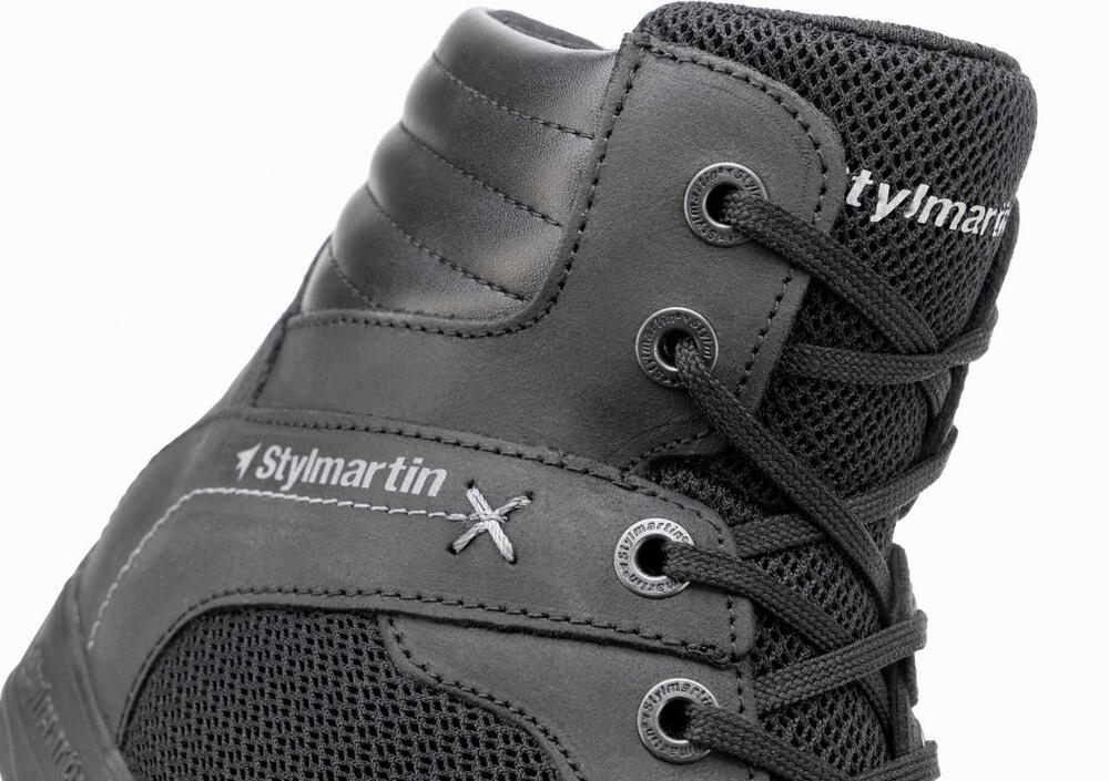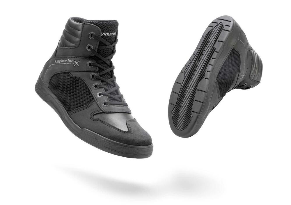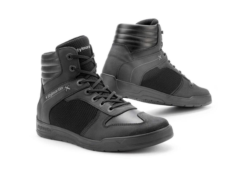 Il look fresco e versatile si distingue per il grintoso Total Black, che caratterizza ogni parte interna ed esterna della calzatura, lacci di chiusura e suola in gomma compresi, arricchito da loghi Stylmartin reflex ad alta visibilità.