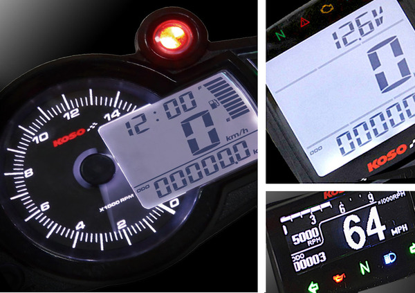 In breve le caratteristiche: Spie (con colori corrispondenti) di folle, impianto luci e allarme temperatura. Tachimetro (sempre con range da 0 a 360 km/h). Trip meter A/B. Voltmetro. Visualizzazioni orologio 24H. Cinque impostazioni di retroilluminazione. Indicazione circonferenza pneumatici. Livello carburante. Dimensioni: 77.5 X 74.8 X 34 mm. Peso: 87 grammi.