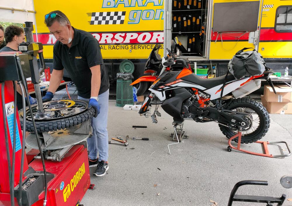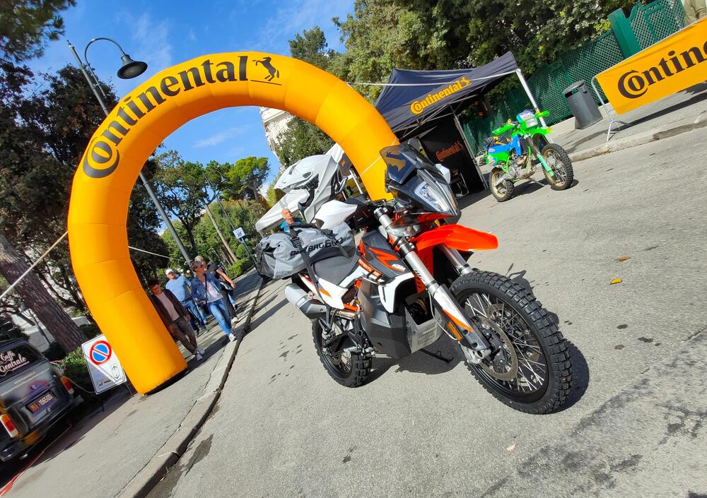 Unica nostra richiesta fatta a Continental dopo aver deciso di partecipare alla Transitalia Marathon, impauriti dalla difficoltà del percorso (poi completamente smentita), era quella di montare un pneumatico da fuoristrada vero. Non qualcosa di ibrido o semitassellati, tacchetto vero con spigolo vivo. Quindi la scelta non poteva che cadere sulle Continental TKC 80 che sulla carta potevano essere davvero il miglior compromesso per un utilizzo asfalto / sterrato. Quindi ci siamo presentati il martedì delle iscrizioni all’evento con la nostra fiammante KTM 890 Adventure R e ci siamo subito recati allo stand Continental, partner tecnico dell’evento per il cambio gomme.