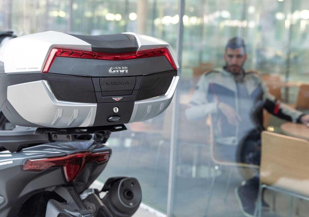 Questa scelta ha permesso di sviluppare una cornice interna (quella che corre tra i due gusci) più rigida e con minori vincoli a livello di forma. Linee filanti e curvature non influiscono sulla robustezza della struttura permettendo di “giocare” con i volumi, come nel caso dei due rigonfiamenti ricavati ai lati del coperchio, che permettono un posizionamento dei caschi all’interno più facile e gestibile. Anche la parte posteriore, solitamente piatta, nella MAXIA 5 cambia forma per agevolare il contatto con la schiena del passeggero.