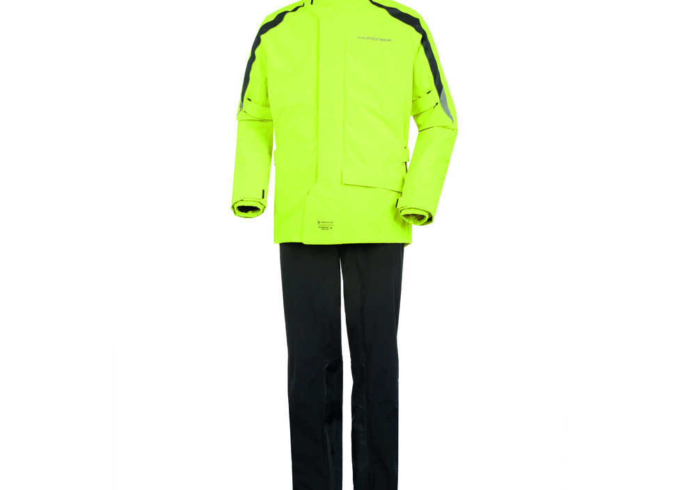 Pensato soprattutto per i lunghi viaggi on the road, il SET DILUVIO PRO si distingue per essere stato realizzato in un pregiato tessuto stretch, in grado di offrire il minimo svolazzamento, anche alle velocità più elevate. L’assoluta impermeabilità è garantita dal sistema registrato HYDROSCUD, una costruzione esclusiva di TUCANO URBANO che si compone di una membrana interna 100 per cento impermeabile (10.000 mm), antivento e traspirante (10.000 gr/mq/24h), di cuciture nastrate, anche sul collo, e di una trappola antiacqua con doppia flap sulla cerniera centrale della giacca. Per preservare la tenuta delle nastrature è stata inoltre predisposta la costruzione a banda sul cavallo e sull’interno gamba, di norma le parti più soggette a usura. Così come è stato anche appositamente rinforzato il fondo interno del pantalone, spesso a contatto con il telaio della moto.