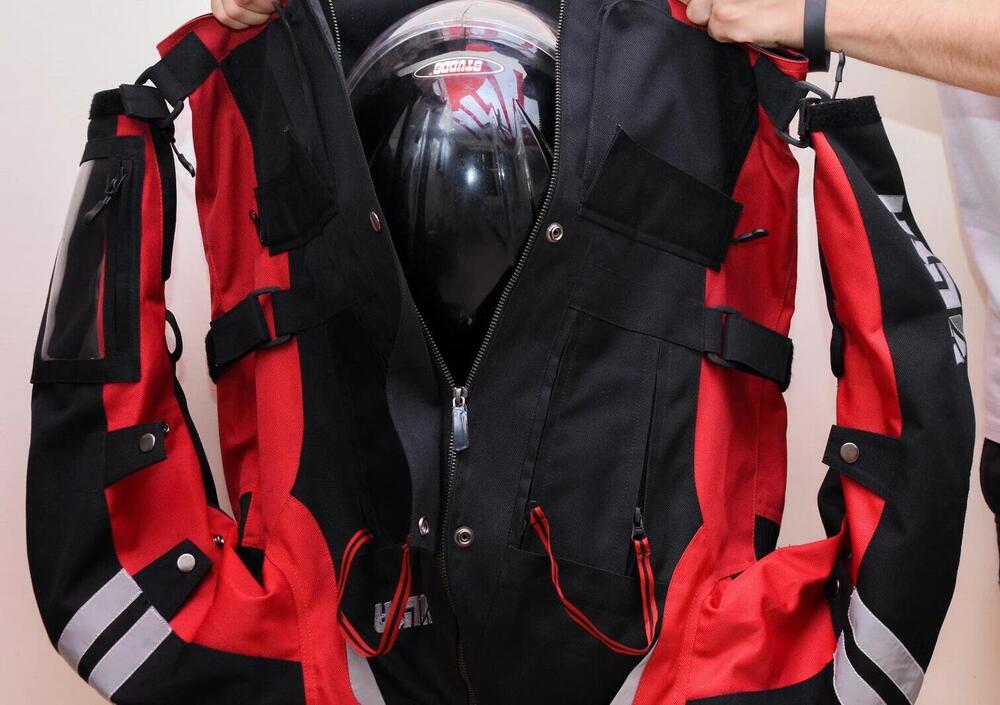 Si tratta di una giacca estiva, traspirante perchè realizzata in tessuto e Cordura, unisex, pensata e prodotta dalla Ulka in India, che in pochi secondi si trasforma in uno zaino da 30 litri di capienza dove riporre, ad esempio, il casco quando si passeggia una volta scesi dalla moto.