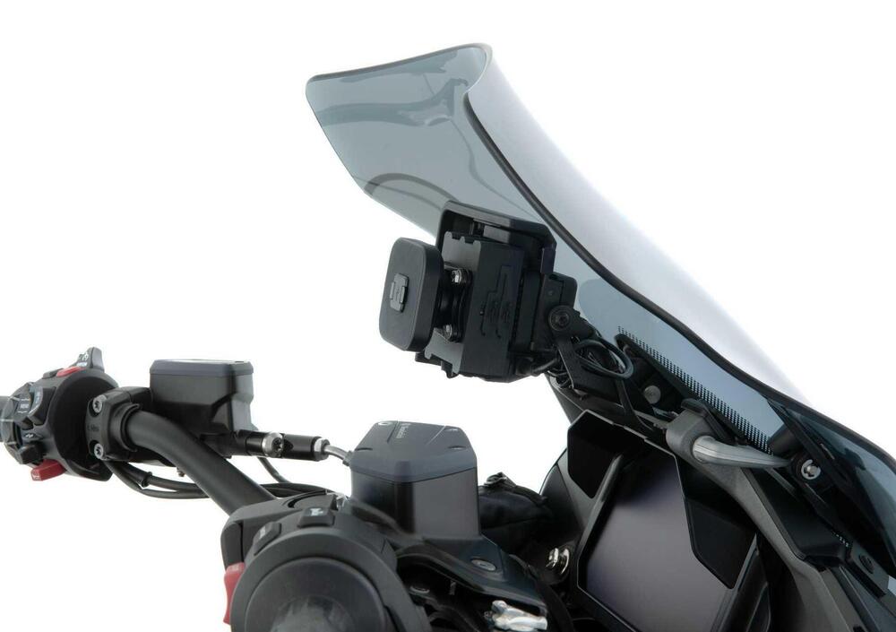 Soluzione compatta senza funzione di ricarica Wireless. Per la ricarica, lo smartphone potrà essere semplicemente collegato tramite cavo a una presa di ricarica USB della moto.