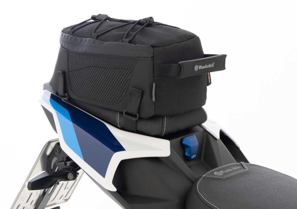 La borsa si fissa sulla moto attraverso due cinghie incrociate con una linguetta sporgente dalla parte posteriore del sedile passeggero che assicura una presa aggiuntiva. Nell'ottica dell'ecosostenibilità, Wunderlich risparmia sull'imballaggio in plastica e consegna la borsa nello zaino per bagagli Wunderlich (44000-xxx), impermeabile e versatile.