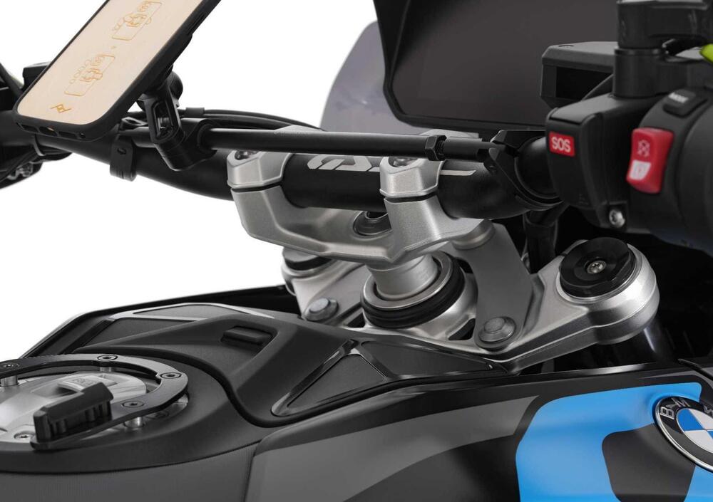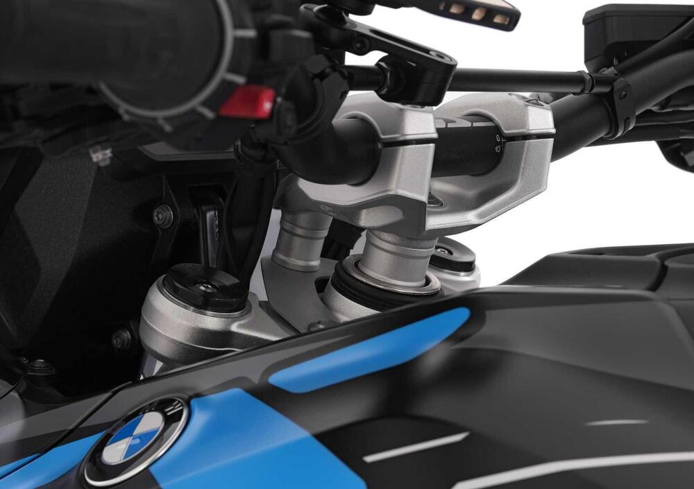 Wunderlich introduce su entrambe le applicazioni un concetto costruttivo specifico per i modelli BMW con Telelever, diverso dalle soluzioni tradizionali in cui il rialzo è “integrato” nel morsetto: qui il ponte del manubrio lavora su due punti di fissaggio definiti, e il rialzo è ottenuto tramite due colonne/distanziali in alluminio ad alta resistenza, lavorate con precisione, che portano il ponte manubrio a +25 mm in modo tecnicamente sofisticato ed esteticamente coerente.