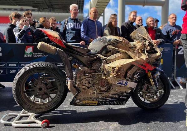 Gara ridotta a 12 dei 14 giri previsti a causa della pioggia, che ha cessato di cadere solo nel corso della gara. La pista bagnata e la scarsa abitudine dei piloti ad utilizzare le Dunlop in queste condizioni (è stata la prima gara bagnata del 2022) ha fatto subito una vittoria illustre in Michele Pirro, caduto all’uscita della prima curva. Una scivolata che ha ricordato quella del 2019, quando il pilota del Team Barni Racing Ducati risalì in sella e iniziò a recuperare posizioni sino ad andare a raccogliere una vittoria incredibile che resterà negli annali del CIV. Questa volta però Pirro non è riuscito a ritornare subito in pista. Rientrato in ultima posizione con un grave ritardo, Michele ha iniziato a girare più velocemente di tutti, tanto che è risalito sino all’ottavo posto, quando però nel corso dell’ottavo passaggio è stato nuovamente vittima di una caduta. Pur se con la moto infangata e danneggiata dalla doppia scivolata, il Campione Italiano uscente ha voluto portare a termine la gara in undicesima posizione, raccogliendo così cinque punti, che hanno incrementato il suo vantaggio in classifica su Alessandro Delbianco.