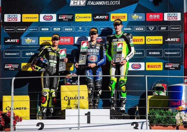 Emozionante e incerta come sempre la gara della Supersport, che così come quella della SBK è stata ridotta di due giri, con un doppio warm up lap. Alla fine è stato un trionfo della Ducati, che non aveva mai vinto nel CIV SS ed oggi ha inflazionato il podio. Vittoria per Nicholas Spinelli che ha avuto la meglio in volata sull’ex Campione del Mondo MotoE Matteo Ferrari. Terza posizione per il rientrante Lorenzo Gabellini. A completare la festa Ducati ci ha pensato Matteo Patacca, che ha tagliato il traguardo al quinto posto.