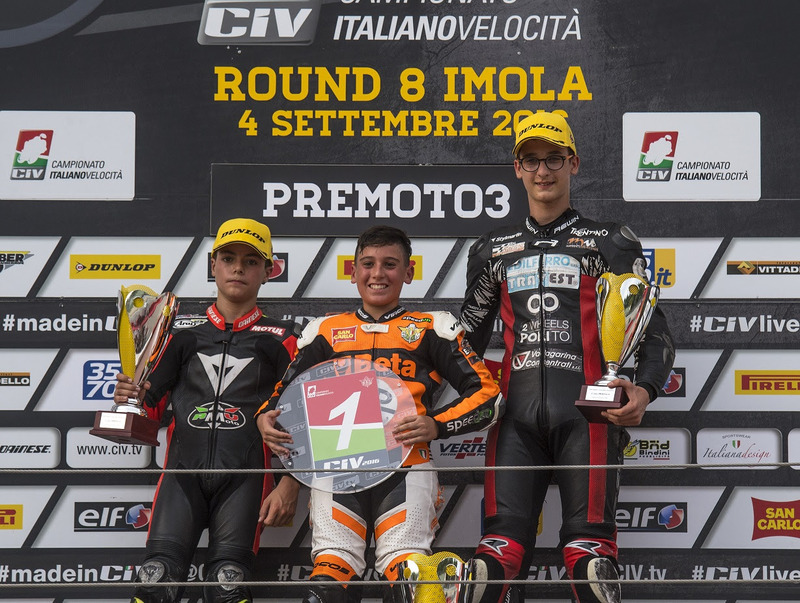 Weekend di doppiette ad Imola. Weekend di prime vittorie e primi titoli. L’Autodromo Enzo e Dino Ferrari ha incoronato Leonardo Taccini come Campione Premoto3 250 4T. Dopo la conquista della targa tricolore lo scorso anno nella Premoto3 125, il pilota Speed Up VL Team ha trionfato anche in questo 2016, nel primo anno di gare nella categoria superiore, dove Taccini è andato sempre a podio, chiudendo i giochi con la doppietta di Imola. Il romano ha trionfato anche oggi, dopo una bella battaglia con Davide Baldini (RMU Racing Team), conclusa solo nelle battute finali. Primo podio per Matteo Bertè (2 Wheels Polito) 3° al traguardo, con Taccini che ha approfittato dell’uscita di scena del rivale Riccardo Rossi (RMU Racing Team). La classifica vede quindi Taccini imprendibile a 181 p. davanti a Rossi (130 p.) e Baldini 3° (114 p.). Nella 125 2T è stato Elia Bartolini (RMU Racing Team) a vincere su Matteo Ripamonti (Honda) e Thomas Rossi (RMU Racing Team). In classifica generale è sempre in testa Giannini (Honda) con 155 p. seguito da Fusco (RMU Racing) a 149 p., rispettivamente 4° e 5° oggi in gara, con la terza posizione occupata da Ripamonti (83 p.) seguito a sole 2 lunghezze da Alfano (GLS Racing Honda) in classifica.
