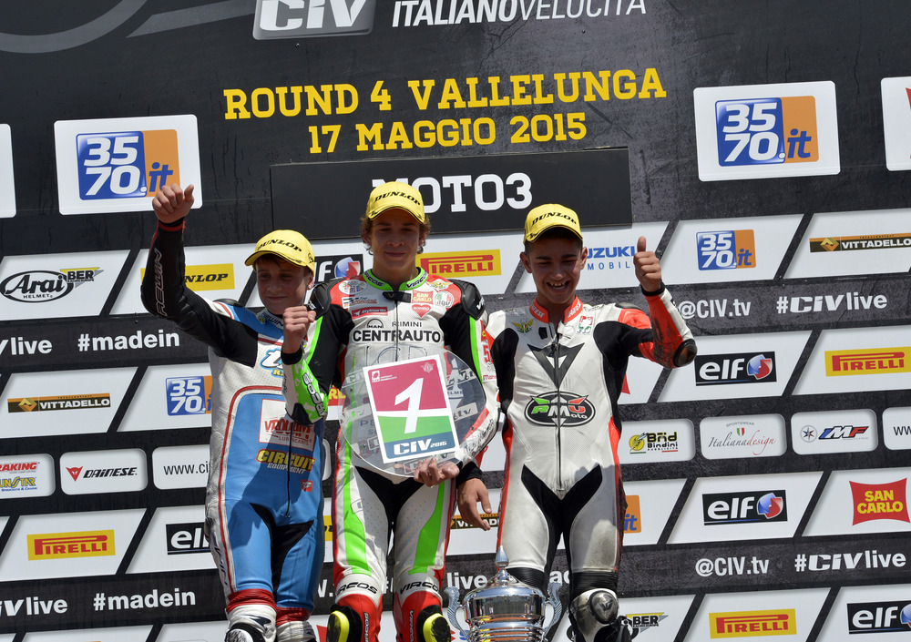 Una SBK che comincia a prendere forma. Una Moto3 che cambia di nuovo padrone. I due round 3570 del CIV a Vallelunga hanno messo in mostra il talento di Michele Pirro. Il pilota Ducati Barni Racing gommato Michelin ha vinto anche la gara di domenica, mettendo a segno una doppietta, che, sommata alla vittoria di Misano, conferma come l’uomo da battere in SBK sia lui. Ci ha provato Perotti a mettere in difficoltà il pugliese, ma dopo alcuni giri in testa, il pilota BMW gommato Pirelli ha ceduto al ritmo di Pirro. Sorpresa al terzo posto, con la Yamaha di Guarnoni che conquista il 1° podio stagionale in un round che ha visto perdere alcuni protagonisti, a cominciare da Ivan Goi, costretto al ritiro per un problema tecnico, con Andreozzi che incappava in una scivolata con la sua Aprilia. Chiudeva al 4° posto Roberto Tamburini. Tabella tricolore che resta nelle mani di Pirro, al comando (75 punti) su Perotti, secondo (58 p.) e Goi, terzo (46 p.)