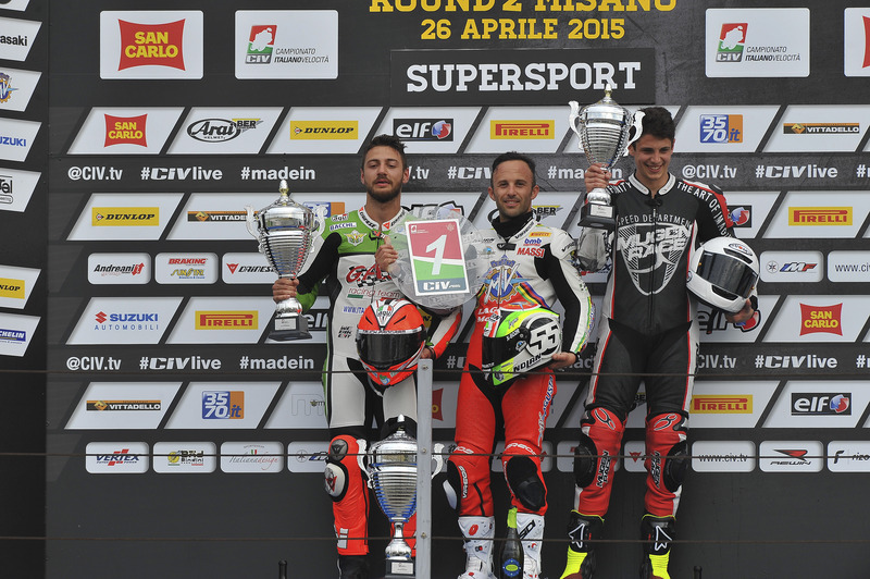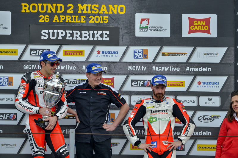 Pirro si è rifatto nella gara della domenica. Questa volta la sua Ducati non lo ha tradito e Michele è partito in testa ed ha vinto per distacco. Doppia gioia per il team Barni, con il terzo posto di Goi che ha ripetuto la rimonta di gara1. In mezzo alle due Ducati gommate Michelin si è piazzata la BMW gommata Dunlop di un incredibile ed inossidabile Alessio Corradi. La classe non è acqua ed il pilota di Langhirano che per anni ha partecipato al mondiale Supersport, si è rifatto della caduta di sabato che lo aveva tolto di scena già nei primi giri. Dopo essersi scrollato di dosso Andreozzi, Guarnoni e Barrier, Corradi li ha staccati in pochi giri, ma purtroppo per lui Pirro era ormai irraggiungibile.