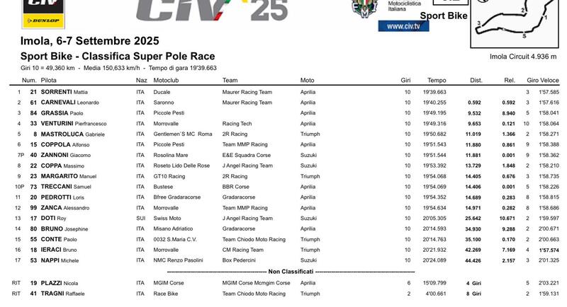La prima notizia di oggi è che per conoscere il vincitore del campionato italiano Sportbike dobbiamo aspettare di assistere all'ultimo round del Mugello, ad inizio ottobre. Questo perchè il capoclassifica Ieraci è scivolato al quinto giro mentre era saldamente al comando, all'ultima variante, non guadagnando quindi nessun punto. Il vantaggio del pilota del CM Racing Team in classifica si è quindi ridotto a 15,5 punti e Mattia Sorrenti, il vincitore della Super Pole Race, si è considerevolmente avvicinato in classifica piloti. Le gare da disputare sono ancora tre, quindi i punti in palio sono 75. Conclusione: il verdetto è rimandato al Mugello.