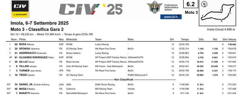Ci ha provato sino al giro 11 di 12 Valentino Sponga. Poi, il leader della gara Marcos Ruda ha iniziato ad incrementare il proprio vantaggio, sino a portarlo al secondo. Questo successo ha consentito allo spagnolo di sfruttare a pieno il primo match point per laurearsi campione italiano Moto3. Un traguardo che raggiunge per la seconda volta consecutiva: cominciano dunque i festeggiamenti in casa Lucky Racing! Il numero 69 ha vinto per solidità e costanza. 5 vittorie, 3 secondi posti, un terzo ed un quarto posto gli hanno permesso di confermarsi alla vetta con un round d'anticipo.