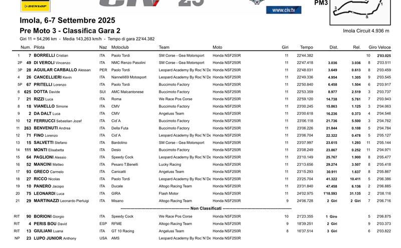 La gara è stata vinta dalla wild card Cristian Borrelli, campione in carica e in questo 2025 impegnato nel FIM JuniorGP, categoria European Talent Cup. Il pilota cremasco è riuscito a creare un distacco sempre più consistente nei confronti dei propri avversari, trionfando con oltre due secondi di vantaggio su Vincenzo Di Veroli e Aguilar. In realtà i due avevano raggiunto il traguardo a posizioni invertite dopo che entrambi erano finiti lunghi ed avevano tagliato l'ultima variante. In seguito, è stato deciso di consegnare il secondo posto a Di Veroli. Quarto Pritelli.