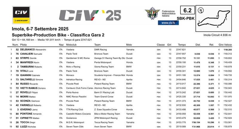 Come si erano concluse le gare di ieri? Vi proponiamo un breve riassunto. In SBK era stato Samuele Cavalieri a vincere, precedendo proprio Delbianco, mentre in Production Bike Stirpe. Parlando della Supersport, si è imposto Ottaviani ed ha approfittato della caduta del suo diretto rivale Xavier Artigas per incrementare il proprio vantaggio a 26 punti. La Moto3 parlava spagnolo con Ruda e la Premoto3 vedeva il campione italiano 2024 Cristian Borrelli, wild card qui ad Imola, rientrare nel Dunlop CIV e salire sul gradino più alto del podio. Per chiudere, Ieraci è stato il vincitore di Gara1 della Sportbike.