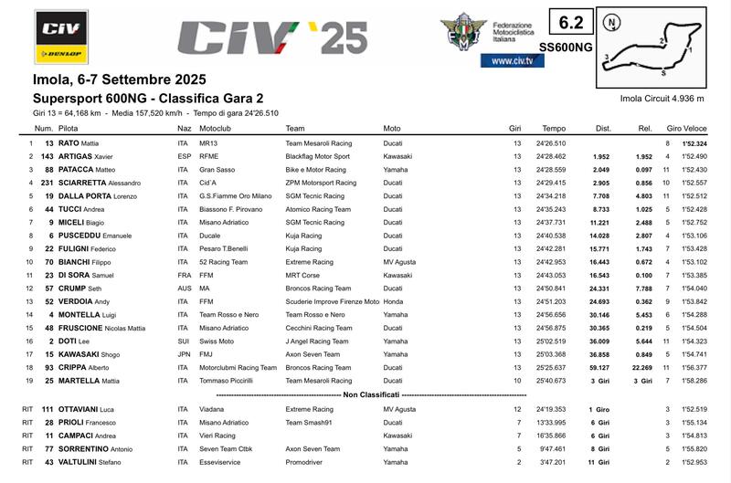 Alle sue spalle c'è Xavier Artigas, che ha conquistato una preziosa medaglia d'argento grazie alla quale i punti di svantaggio nei confronti di Luca Ottaviani diminuiscono da 26 a 6. Lo spagnolo è riuscito a superare Matteo Patacca (terzo) all'ultima variante, nel corso dell'ultimo giro, ottenendo così 20 punti preziosissimi in ottica campionato. Infatti, il leader di classifica Ottaviani, membro della squadra Extreme Service, è scivolato affrontando la Variante Bassa al giro 8 di 13, mentre si trovava terzo ed all'inseguimento proprio di Artigas. Dunque, zero punti conquistati in Gara1 da parte del numero 111. Il campionato si deciderà al Mugello.