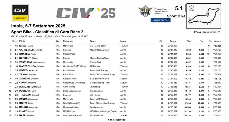 Ieraci resta leader, con 27,5 punti di vantaggio su Sorrenti. Grassia al terzo posto. Come detto, questo campionato si decide all'ultimo round del Mugello, assieme a SS e Premoto3.
