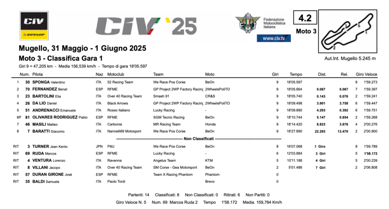 In Moto3 il gradino più alto del podio è sato conquistato da Valentino Sponga, primo podio e prima vittoria per il pilota del team We Race Pos Corse. Valentino chiude davanti a Benat Fernandez, GP Project 2WP Factory Racing ed Elia Bartolini del team Smash 91.