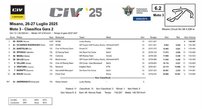 Marcos Ruda ha completato la doppietta, trionfando anche in Gara2 con quasi dieci secondi di vantaggio sul connazionale Pablo Olivares Rodriguez. Il vincitore ha confermato di trovarsi particolarmente a proprio agio sul tracciato romagnolo e nel corso di questa seconda manche non ha mai lasciato la testa della corsa. Olivares, superato Elia Bartolini durante il secondo giro, ha provato ad inseguire Ruda, ma il leader della corsa aveva già un margine di oltre tre secondi. Il pilota numero 81 ha così concluso secondo, precedendo proprio Bartolini.
