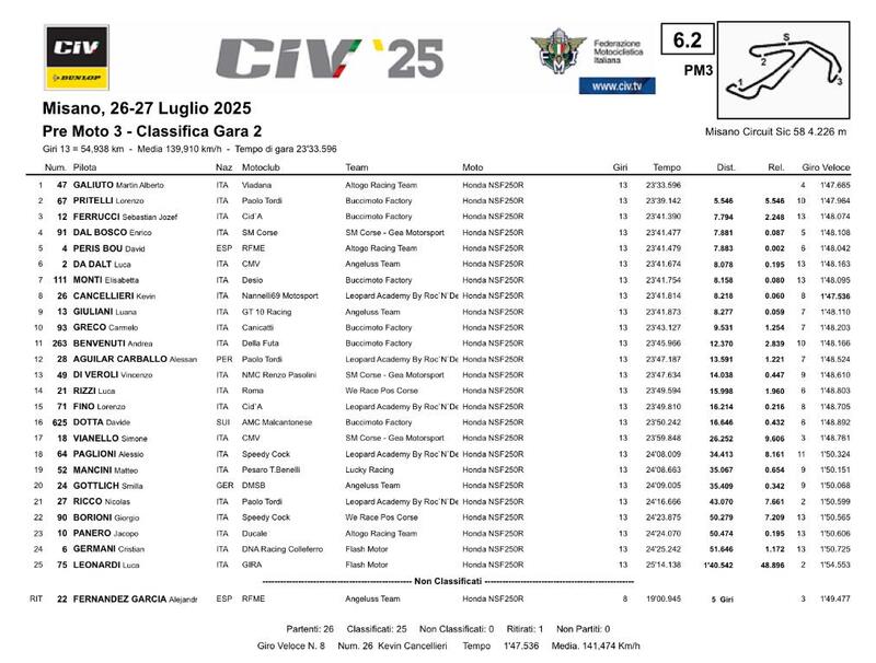 La seconda ed ultima gara del week end della Premoto3 è stata vinta da Martin Alberto Galiuto, che a partire da questa tappa è tornato a vestire i colori del team Altogo. Il pilota numero 47 ha ottenuto la seconda top 3 del fine settimana, dopo quella di ieri. Oggi, Galiuto ha mantenuto la prima posizione per tutti e tredici i giri, incrementando costantemente il proprio vantaggio su Lorenzo Pritelli sino ad arrivare ad avere ben cinque secondi e mezzo di margine quando è transitato sotto la bandiera a scacchi. L'alfiere di Buccimoto Factory è scattato dalla seconda casella in griglia di partenza e secondo è rimasto per tutta la corsa.