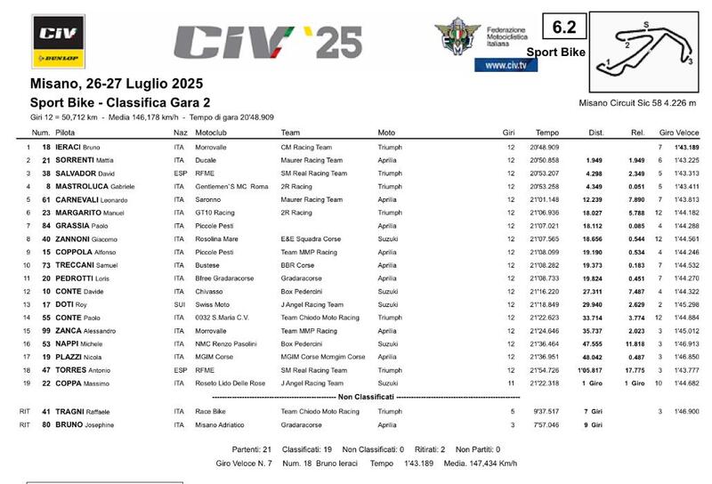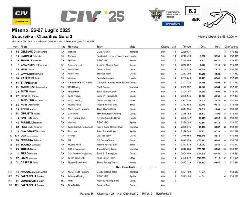 Grazie alla doppietta, Delbianco ha 195 punti in campionato, 71 in più di Giannini e 76 in più di Michele Pirro. Proprio Pirro è scivolato all'inizio del quinto giro mentre era quarto. Rientrato in pista, ha terminato la corsa in ventiquattresima posizione. Stirpe è al comando in PBK, con 170 lunghezze in totale. Secondo è Riccardo Russo con 160, terzo è Simone Saltarelli #73 con 106.