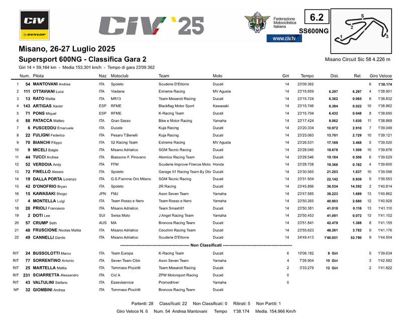 Il Campionato Italiano Velocità 2025 è al giro di boa: al Misano World Circuit si corre infatti il quarto round stagionale, su un totale di sei. Questo pomeriggio si disputa Gara2 di ogni categoria. Vi ricordiamo che Gara1 della Superbike/Produciton Bike e Gara1 della Supersport 600NG si sono svolte nella mattinata di oggi, domenica 27 luglio, dopo che la Racing Night di ieri sera era stata annullata a causa delle condizioni meteo avverse.