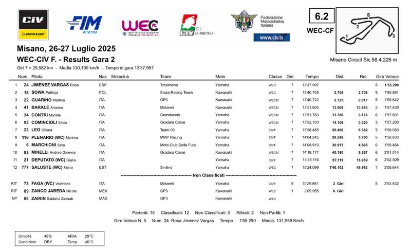 La top 3 della classifica assoluta recita: Rosa Jimenez Vargas, Patrycja Sowa e Martina Guarino. Il duo di testa si è scambiato le posizioni rispetto a quanto era accaduto in Gara1, ricordandovi che la spagnola e la polacca competono esclusivamente nel campionato europeo. Guarino appartiene invece alla classifica che tiene conto anche del campionato italiano ed è dunque lei la vincitrice di Gara2 del CIV Femminile. La pilota numero 22 è seguita da Arianna Barale e Matilde Contri, che completano il podio tricolore. Entrambe appartengono infatti, come Guarino, alla classifica WECIV (WEC + CIV Femminile).