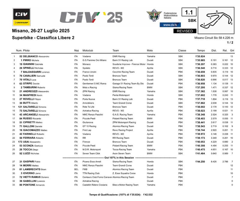 Nelle Libere 1 di ieri sera, la top 3 della SBK era composta da Delbianco (1:36.153), Pirro (1:36.175) e Spinelli (1:36.621), mentre in PBK da Baldassarri (1:36.547), Stirpe (1:37.634) e Simone Saltarelli #73 (1:37.705).