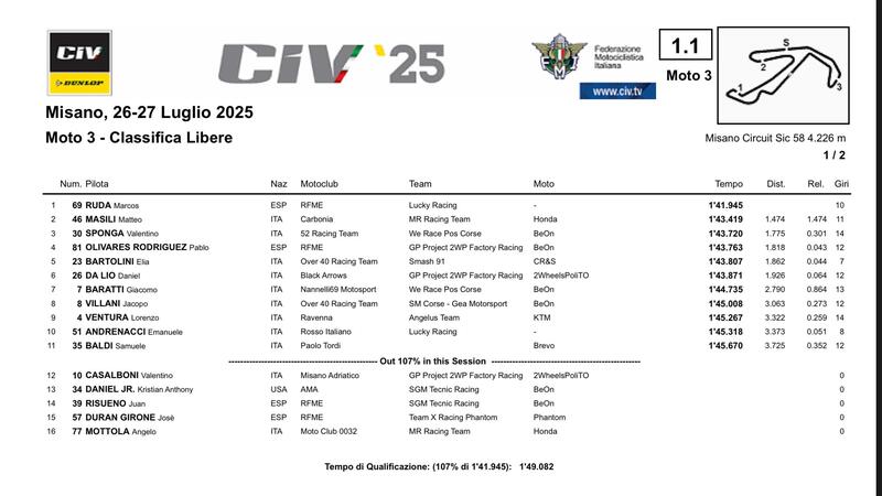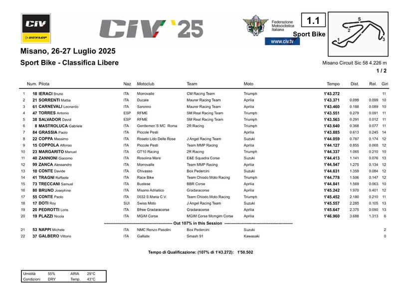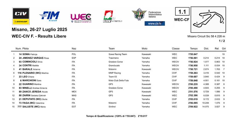 Primo posto nelle Libere per Bruno Ieraci in 1:43.272, con Mattia Sorrenti secondo e Alessandro Carnevali terzo in 1:43.460. Quarto Antonio Torres Dominguez e quinto David Salvador, che restano entro i tre decimi di ritardo dalla vetta.