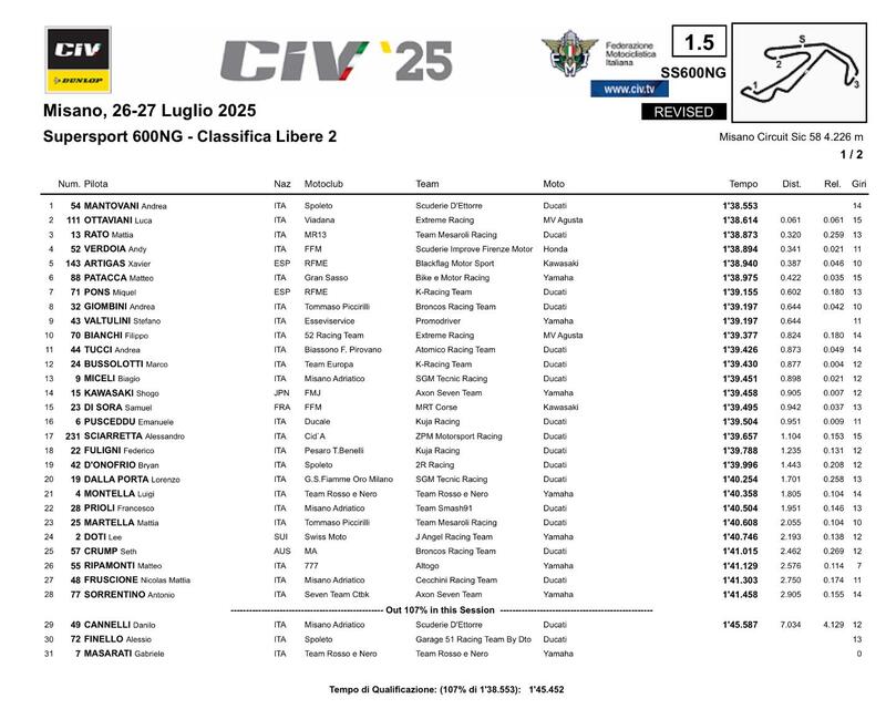 In Supersport 600 NG davanti a tutti c'è Andrea Mantovani con un giro chiuso in 1:38.553. Il distacco da Luca Ottaviani e Mattia Rato è minimo, infatti i tre sono racchiusi in poco più di tre decimi. Quarto Andy Verdoia, quinto Xavi Artigas.