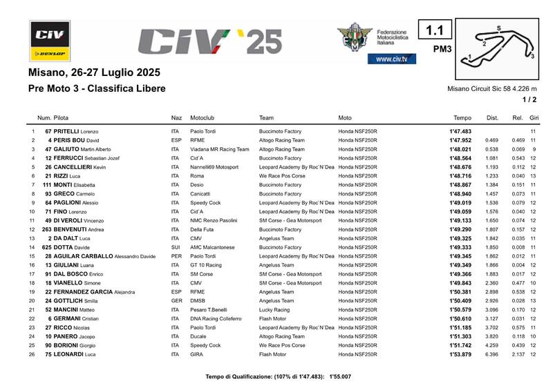 Primo tempo nelle prove libere per Lorenzo Pritelli. Il pilota di Buccimoto Factory ha realizzato il miglior giro in 1:47.483. Lo insegue a circa mezzo secondo lo spagnolo David Peris Bou, che è marcato a meno di un decimo da Martin Alberto Galiuto in 1:48.021. Chiudonio la top 5 Sebastian Ferrucci e Kevin Cancellieri, a poco più di un secondo dal primo tempo di Pritelli.