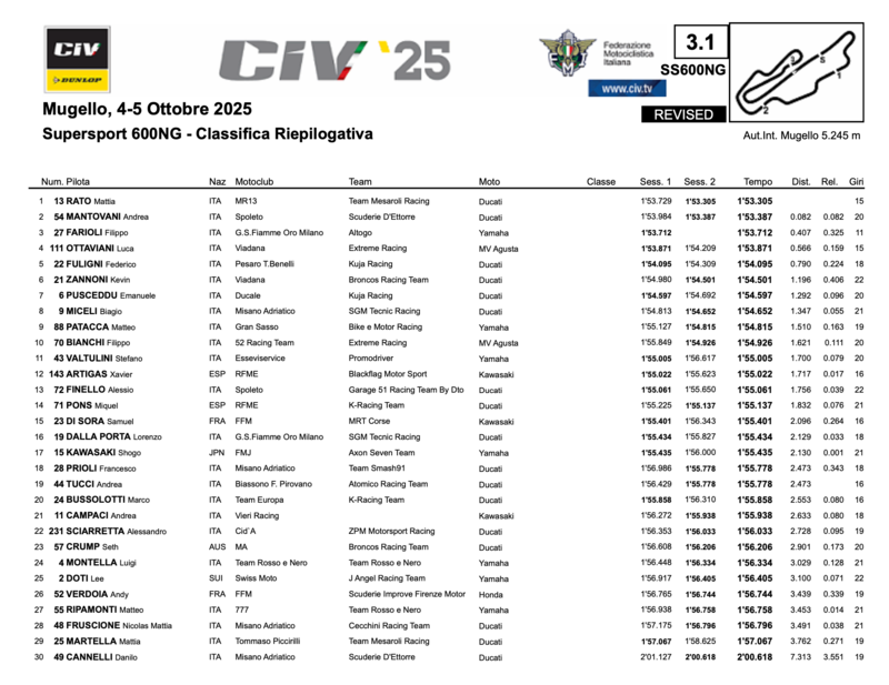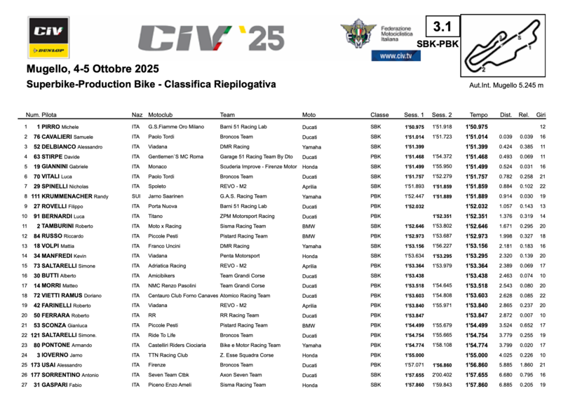 Seconda sessione di Qualifica impegnativa al Mugello a causa delle temperature molto basse, circa 9 gradi. Michele Pirro si conferma il più veloce con un best lap di 1:50.975. Molto vicino Samuele Cavalieri con solo 0.039 di ritardo (1:51.014). Terza posizione per Alessandro Delbianco, Campione Italiano 2025., che dopo pochi giri è caduto nell'ultimo settore, bandiera rossa.