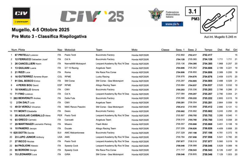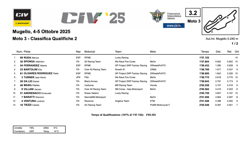 In Moto3 pole di Marcos Ruda, già Campione Italiano 2025. Il pilota spagnolo ha chiuso il miglior giro in 1:57.152 distaccando Valentino Sponga di poco più di sei decimi (1:57.804). Terza casella per Alberto Ferrandez del GP Project 2WP Factory Racing.