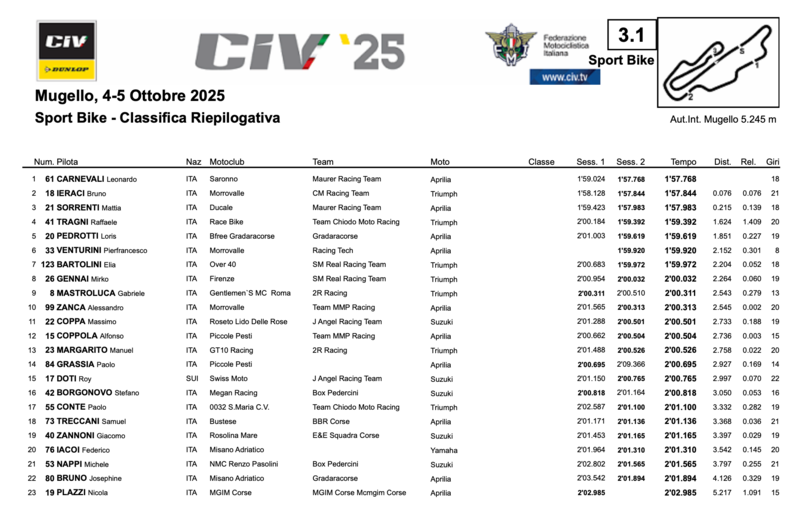 In Sport Bike Pole position di Leonardo Carnevali del Maurer Racing Team. Il best lap è di 1:57.768 con giusto 0.076 di distacco da Bruno Ieraci. Mattia Sorrenti chiude il terzetto di testa.