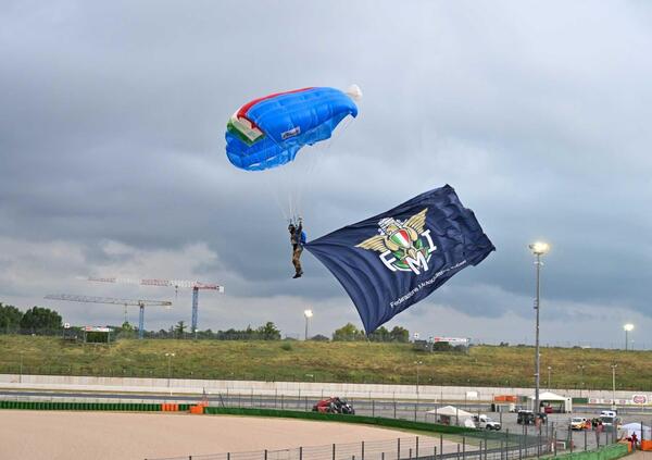 La tanta pioggia caduta a Misano il pomeriggio di sabato 26 luglio avrà sì rimandato le gare al giorno dopo, ma di certo non ha spento l’entusiasmo del pubblico, comunque molto presente in circuito. E nemmeno fermato alcune delle attività che hanno arricchito la CIV Racing Night 2025, su tutte quelle portate in pista dall’Esercito Italiano, a cominciare dallo spettacolare aviolancio.