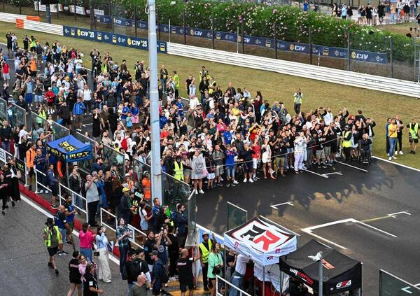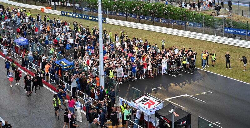 Il sabato pomeriggio della CIV Racing Night è da sempre il momento degli eventi dedicati al pubblico. Tante sono state le persone che, nonostante la pioggia, hanno fatto il giro di pista a bordo del trenino panoramico, riversandosi poi in pit lane per vedere da vicino i loro beniamini all’interno dei box dei loro team e accedendo poi direttamente in pista, sulla griglia di partenza, per apprezzare lo spettacolare atterraggio dei paracadutisti dell’Esercito al momento dell’aviolancio.