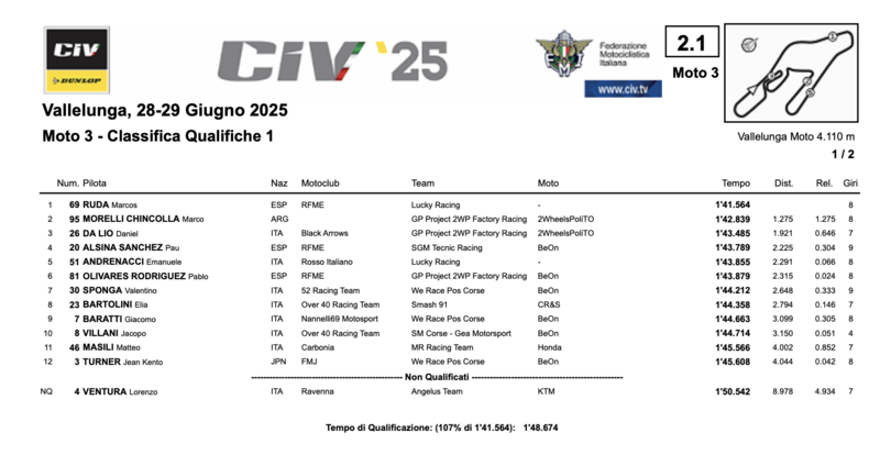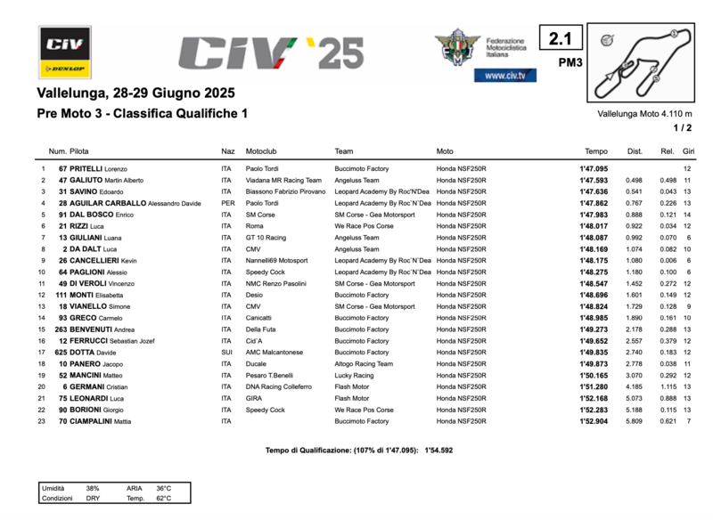 Pole provvisoria per Martin Alberto Galiuto. Il pilota del Angeluss Team ha realizzato il miglior giro in 1:47.176. Lo insegue vicinissimo Lorenzo Pritelli del Team Buccimoto Factory, soli +0.051 di ritardo su Pritelli. Terza posizione provvisoria Edoardo Savino.