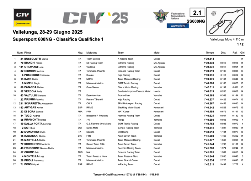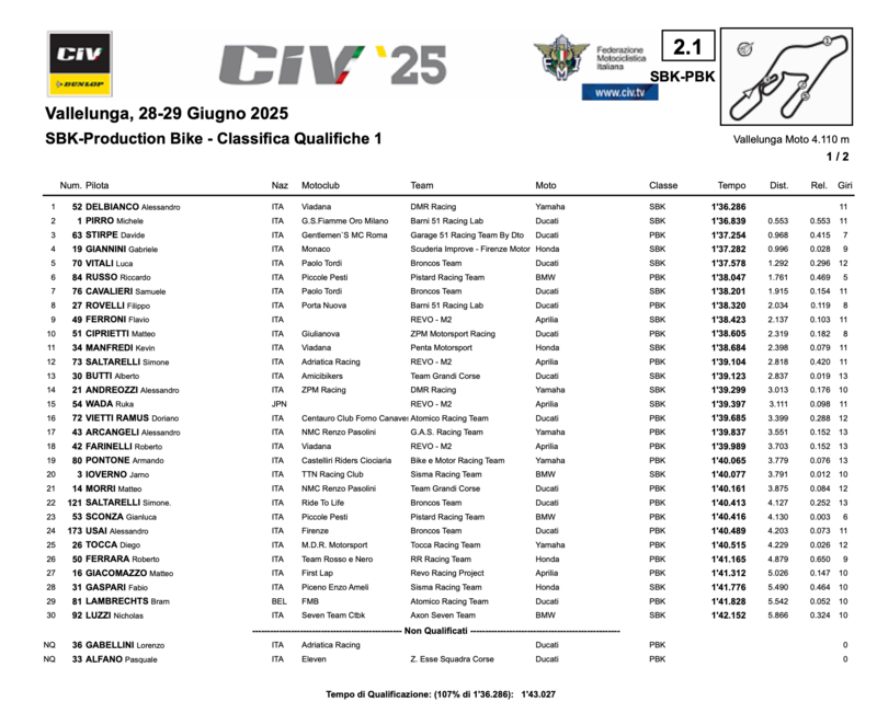 La prima sessione di Qualifica della SBK porta il nome di Alessandro Delbianco. Il pilota del DMR Racing Team sembra essere a proprio agio a Vallelunga. 1:36.286 è il best lap, più di mezzo secondo il distacco da Michele Pirro, secondo, con un 1:36.839. Terzo posto in SBK per Gabriele Giannini.