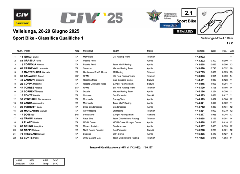 La Q1 della Sport Bike a Vallelunga cede spiccare un velocissimo Bruno Ieraci in sella alla Triumph del CM Racing Team (1:42.922). 3 decimi separano Ieraci e Paolo Grassia con Aprilia (1:43.222). Terza posizione virtuale per Alfonso Coppola (1:43.618).