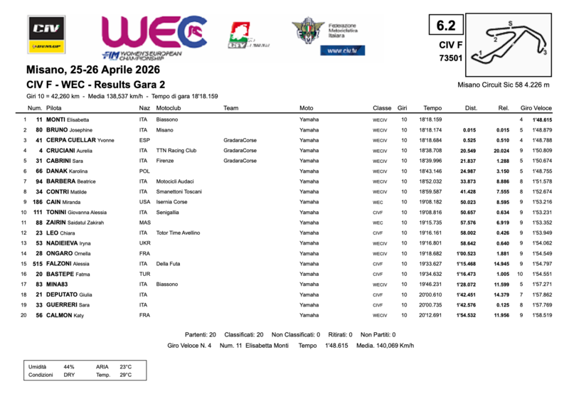 Elisabetta Monti si prende Gara 2 del CIV Femminile / WEC su Josephine Bruno al traguardo, giro veloce in 1'48.615 al quarto passaggio, e un risultato che ribalta completamente la classifica rispetto a ieri. La pilota di Biassono — quarta in Gara 1 — scala in vetta e porta a casa il secondo successo di giornata per le pilote italiane.