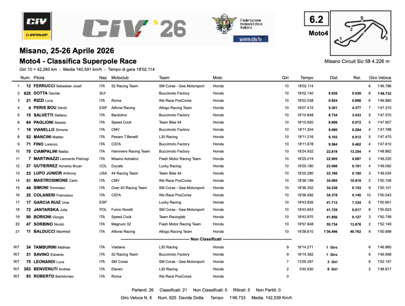 Sebastian Jozef Ferrucci (SM Corse – Gea Motorsport) si prende la Superpole Race della Moto4 con uno scarto di 26 millesimi su Davide Dotta (Buccimoto Factory) — la terza volta in questo weekend che la Moto4 di Misano decide tutto sul filo del traguardo. Il pilota del 52 Racing Team controlla i dieci giri e porta a casa una vittoria che vale oro in chiave griglia di partenza per Gara 2, con Dotta autore del giro veloce personale in 1'46.733 al sesto passaggio.