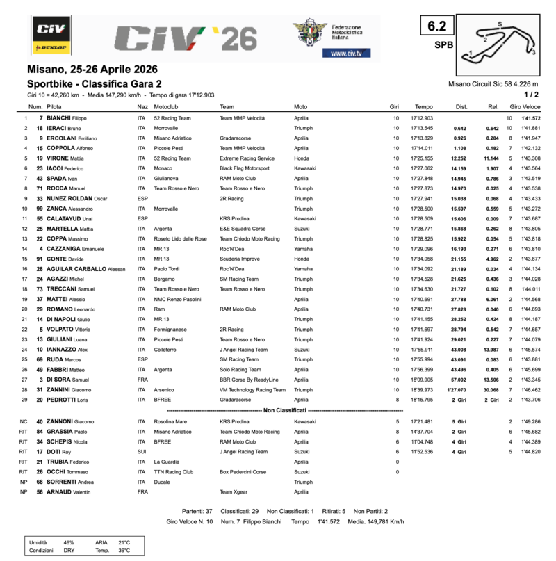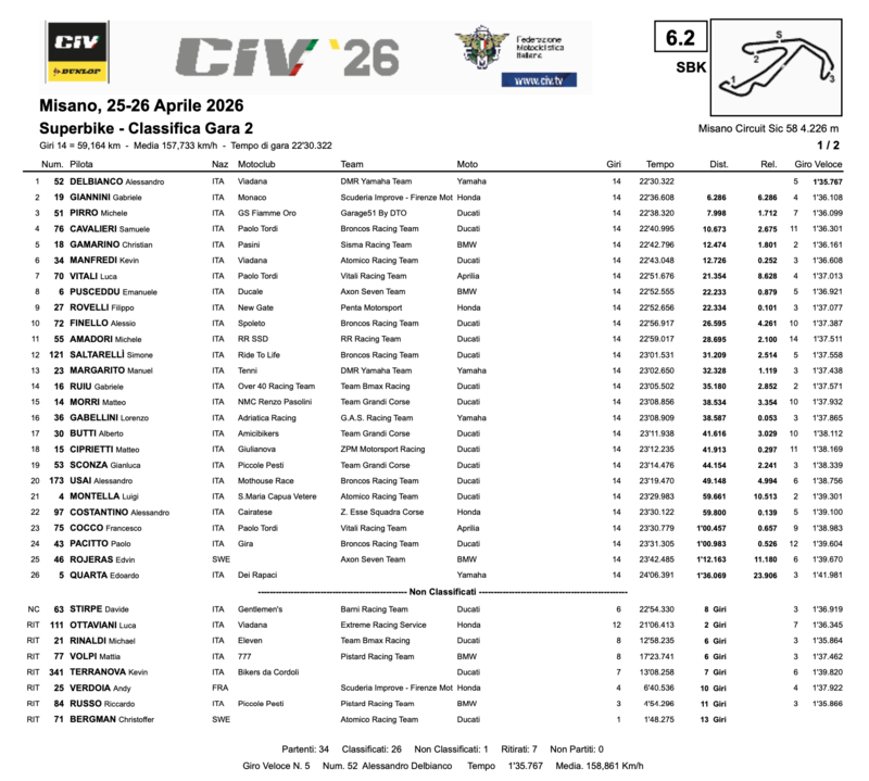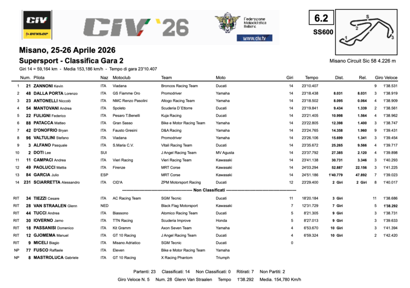 Sette i ritirati: oltre a Van Straalen, si fermano Tiezzi (caduta alla curva 4), Tucci (caduta alla curva 1), Ioverno (caduta alla curva 1), Passanisi e Gjomema per problemi tecnici alla curva 8 — quest'ultima la curva più pericolosa della giornata — e Miceli che non completa nemmeno il giro di formazione. Due i non partenti: Fusco e Mastroluca. Sciarretta classificato quattordicesimo ma con due giri di ritardo. Un finale di weekend amaro per molti, ma Zannoni sorride: il CIV 2026 ha il suo primo dominatore.