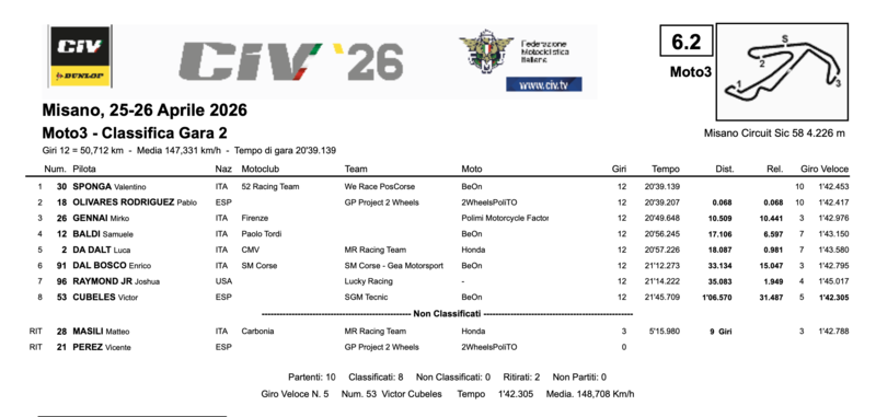 Valentino Sponga (We Race PosCorse, BeOn) è il grande protagonista di Gara 2 della Moto3: il pilota romano, quinto ieri, si trasforma oggi e vince con 68 millesimi di margine su Pablo Olivares Rodriguez (GP Project 2 Wheels, 2WheelsPoliTO) al termine di una battaglia durata dodici giri. Un risultato che ribalta completamente la classifica rispetto a ieri e che regala al CIV 2026 la sua prima sorpresa di stagione.
