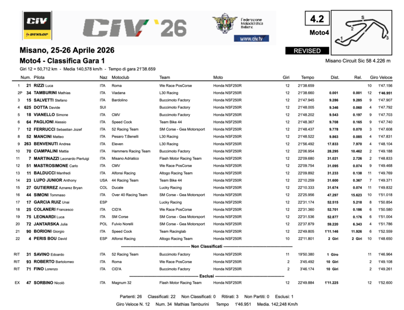 Luca Rizzi (We Race PosCorse) vince Gara 1 della Moto4 al Misano World Circuit con il margine più esiguo immaginabile: un solo millesimo su Mathias Tamburini (L30 Racing), esattamente come era successo in qualifica con il tempo identico. La storia si ripete, ma questa volta con la bandiera a scacchi: 21'38.659 contro 21'38.660, dodici giri di battaglia pura che si decidono sulla linea del traguardo. Un epilogo che il motorsport riserva raramente, e che Misano si è presa tutta.