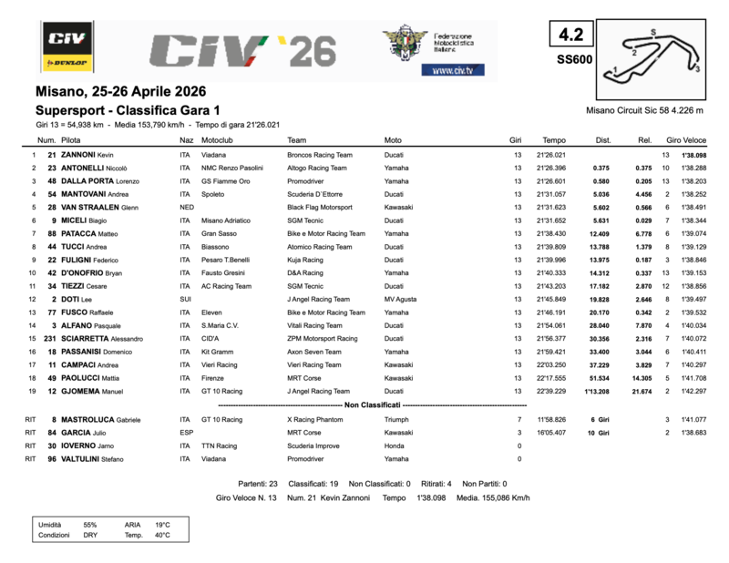 Supersport: Zannoni domina e vince, Antonelli e Dalla Porta sul podio. Il pilota del Broncos Racing Team porta a casa una vittoria costruita giro dopo giro, autore anche del giro veloce. Tre ritirati, tra cui Garcia per problemi tecnici