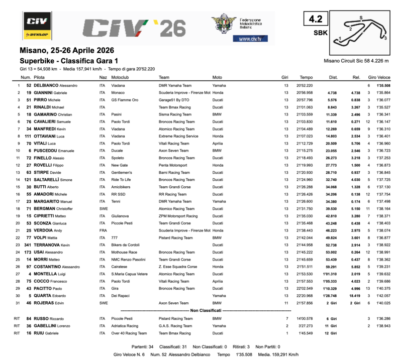 Alessandro Delbianco (DMR Yamaha Team) non lascia spazio a interpretazioni: parte dalla pole, prende subito il comando e non lo cede più. Tredici giri in gestione totale, vittoria centrata in 20'52.220 con 4.738 secondi di margine sul secondo classificato. Il CIV Superbike 2026 si apre con un messaggio chiarissimo: la Yamaha R1 di Delbianco è l'riferimento del lotto.