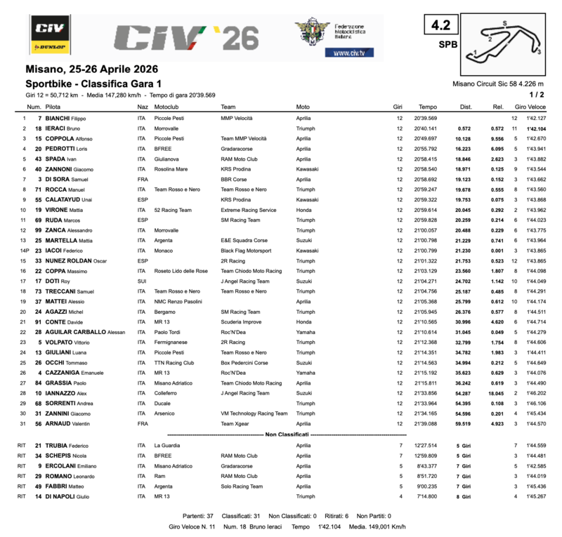 Terzo Alfonso Coppola (Team MMP Velocità, Aprilia) a 10.128 secondi — doppietta MMP Velocità vanificata solo dal ritmo di Ieraci. Quarto Loris Pedrotti (Gradaracorse, Aprilia) a 16.223, quinto Ivan Spada (RAM Moto Club, Aprilia) a 18.846. Poi la bagarre: sesto Giacomo Zannoni (KRS Prodina, Kawasaki), settimo Samuel Di Sora (BBR Corse, Aprilia), ottavo Manuel Rocca (Team Rosso e Nero, Triumph), nono Unai Calatayud (KRS Prodina, Kawasaki), decimo Mattia Virone (Extreme Racing Service, Honda) — questi cinque racchiusi in meno di 800 millesimi, una guerra di posizione durata dodici giri.