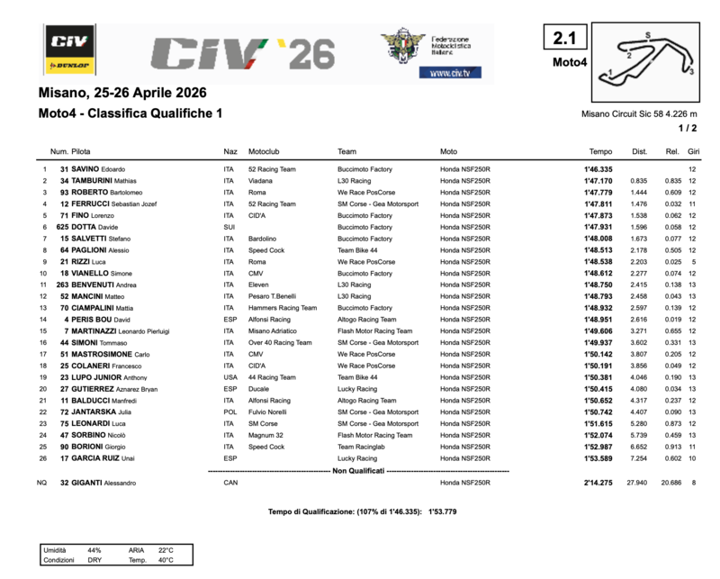 Edoardo Savino centra la pole position nelle Qualifiche 1 della Moto4 al Misano World Circuit Marco Simoncelli, aprendo nel migliore dei modi il weekend del CIV 2026. Il pilota del team Buccimoto Factory ha fermato il cronometro sull'1'46.335, frutto di un miglioramento progressivo e costante lungo l'intera sessione: otto giri veloci consecutivi, ciascuno più rapido del precedente, fino al guizzo finale a 16:08 che ha consacrato la sua superiorità.