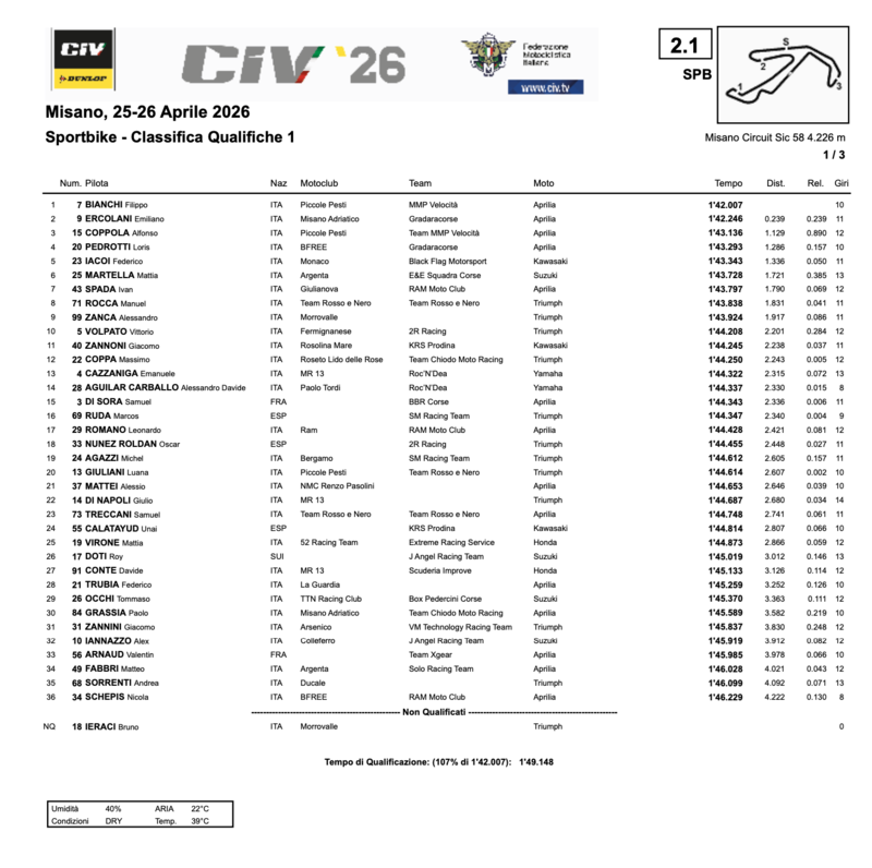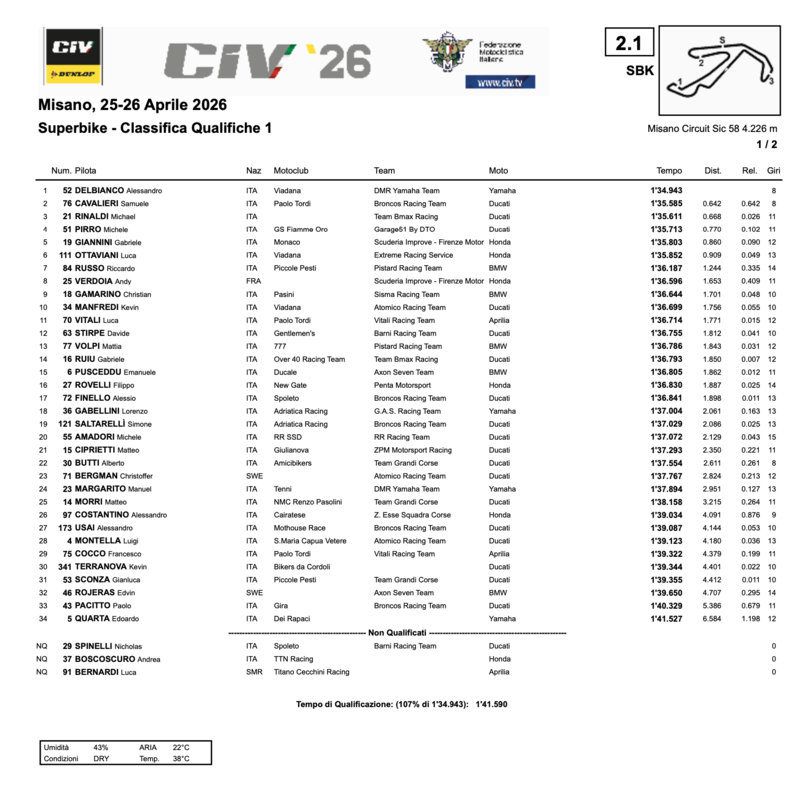 In seconda posizione si piazza Samuele Cavalieri (Broncos Racing Team, Ducati) a 0.642, mentre completa la prima fila Michael Rinaldi (Team Bmax Racing, Ducati) a soli 26 millesimi dal compagno di marca. Quarto posto per Michele Pirro (Garage51 By DTO, Ducati) a 0.770: il veterano delle derivate dalla serie porta esperienza e velocità, ma per ora non basta a impensierire il poleman. Quinta e sesta posizione per le Honda di Gabriele Giannini (Scuderia Improve – Firenze Motor) e Luca Ottaviani (Extreme Racing Service), entrambi a meno di un secondo da Delbianco — un segnale di competitività che potrebbe farsi sentire in gara.