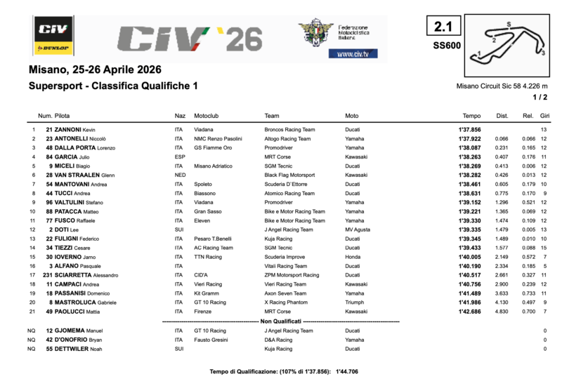Kevin Zannoni si prende la pole position nelle Qualifiche 1 della Supersport a Misano, regalando al Broncos Racing Team e alla Ducati il miglior crono della sessione in 1'37.856. La prestazione del pilota di Viadana è il frutto di una costruzione cronometrica esemplare: quattro giri consecutivi in miglioramento nella fase finale della sessione — da 1'38.237 fino al definitivo 1'37.856 siglato a 17:30 — che hanno liquidato ogni residua ambizione degli avversari.